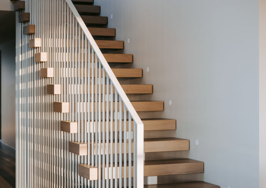 The stairwell becomes a sculptural and structural feature in its own right. A steel-and-timber stair spine threads through the treads, offering clarity and crafted expression, while architectural lighting introduces depth and shadow, subtly guiding movement between levels and accentuating material transitions throughout the home.